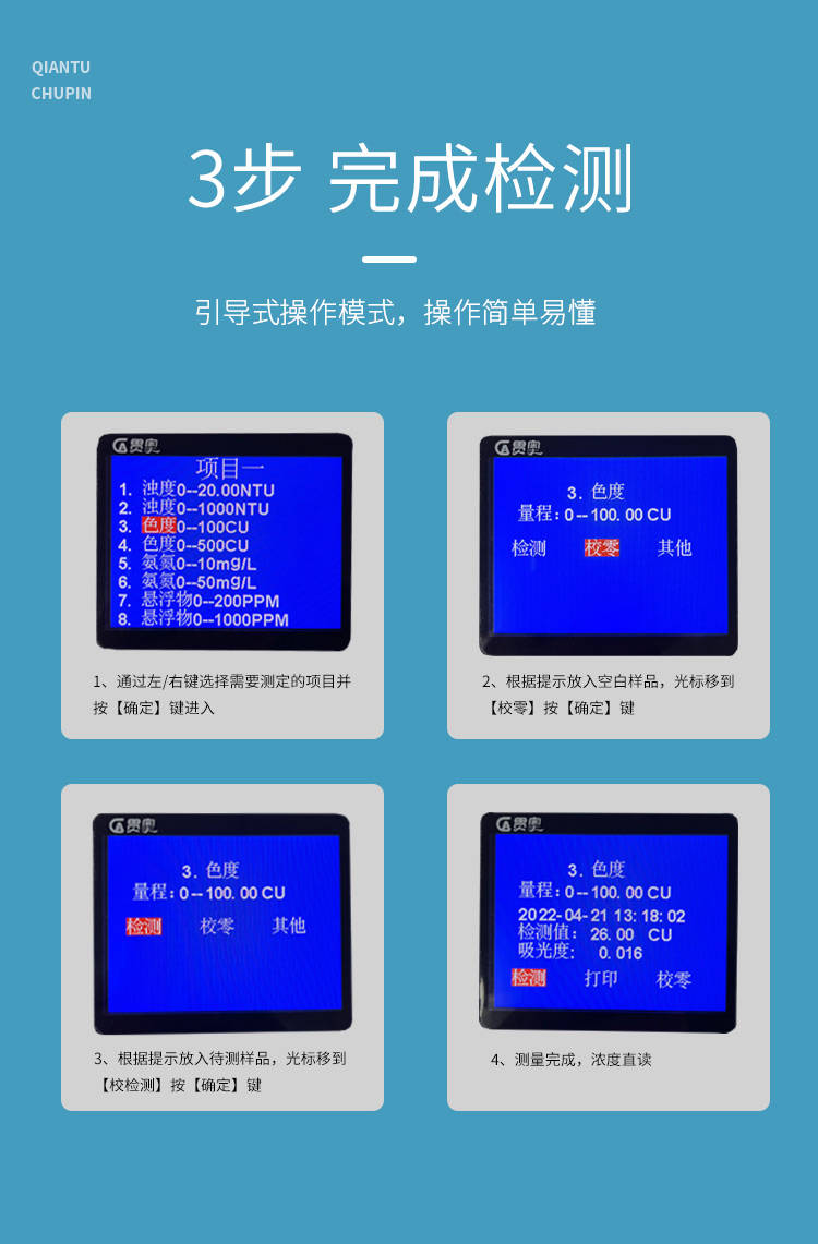 貫奧色度檢測儀可快速準(zhǔn)確測定地表水、地下水、城市污水及工業(yè)廢水中色度指標(biāo),濃度直讀;可廣泛用于水廠、食品、化工、冶金、環(huán)保及制藥行業(yè)等部門。儀器是由單個的固定波長固定用途的分光光度計糅合而成的,采用分光光度法原理對各參數(shù)進(jìn)行測量,在儀器中建立不同參數(shù)的濃度顯色程度與吸光度的線性曲線,儀器通過對顏色的辨別,得出被測水樣的濃度。本儀器采用全中文菜單,操作簡易易懂,使用方便快速測量準(zhǔn)確度高。